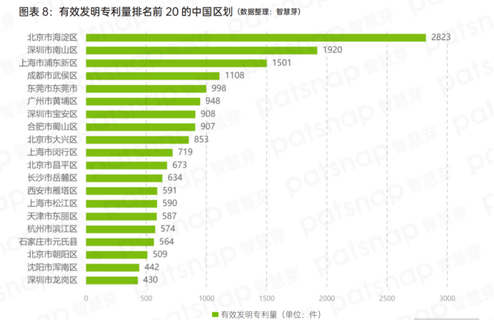 在“專(zhuān)精特新”小巨人企業(yè)專(zhuān)利能力的區(qū)域分布上,如果將顆粒度進(jìn)一步細(xì)分到區(qū),可以看到有效發(fā)明專(zhuān)利量排名前20的分別是,北京市海淀區(qū)、深圳市南山區(qū)、上海市浦東新區(qū)、成都市武侯區(qū)、廣東省東莞市、廣州市黃埔區(qū)、深圳市寶安區(qū)、合肥市蜀山區(qū)、北京市大興區(qū)和上海市閔行區(qū);11-20名的區(qū)域則有北京市昌平區(qū)、長(zhǎng)沙市岳麓區(qū)、西安市雁塔區(qū)、上海市松江區(qū)、天津市東麗區(qū)、杭州市濱江區(qū)、石家莊市元氏縣和北京市朝陽(yáng)區(qū)。