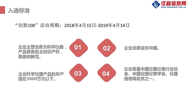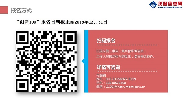 后續(xù),“創(chuàng)新 100”還將繼續(xù)走訪報(bào)道北京、天津、深圳、福建、江浙滬等地的儀器廠商,通過篩選“科學(xué)儀器行業(yè)最具成長潛力企業(yè)”、撰寫中小儀器企業(yè)創(chuàng)新能力調(diào)研報(bào)告等形式,依托儀器信息網(wǎng)媒體資源,形成“創(chuàng)新 100”企業(yè)傳播的倍增效應(yīng)?!皠?chuàng)新 100”申報(bào)截止至 2018 年 12 月 31 日,歡迎符合如下條件的儀器企業(yè)積極申報(bào)。