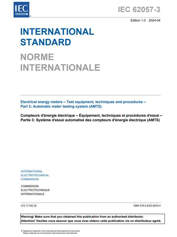 由我國主導制定的國際標準《IEC 62057-3電能表測試設備、技術和步驟 第3部分:電能表自動化試驗系統(AMTS)》于2024年4月23日正式由國際電工委員會(IEC)發布,這是中國首次在電能計量領域主導制定IEC國際標準。