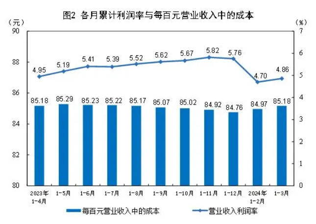 1-3月份,規(guī)模以上工業(yè)企業(yè)每百元營業(yè)收入中的成本為85.18元,同比增加0.16元;每百元營業(yè)收入中的費(fèi)用為8.54元,同比減少0.07元。