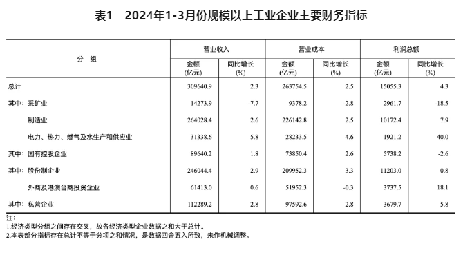 1-3月份,規(guī)模以上工業(yè)企業(yè)實(shí)現(xiàn)營業(yè)收入30.96萬億元,同比增長2.3%;發(fā)生營業(yè)成本26.38萬億元,增長2.5%;營業(yè)收入利潤率為4.86%,同比提高0.09個百分點(diǎn)。