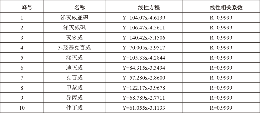 10種氨基甲酸酯在0.05~10.0 mg/L(測(cè)試濃度)范圍內(nèi)均達(dá)到0.9999線(xiàn)性相關(guān)系數(shù),具有良好的線(xiàn)性相關(guān)性。