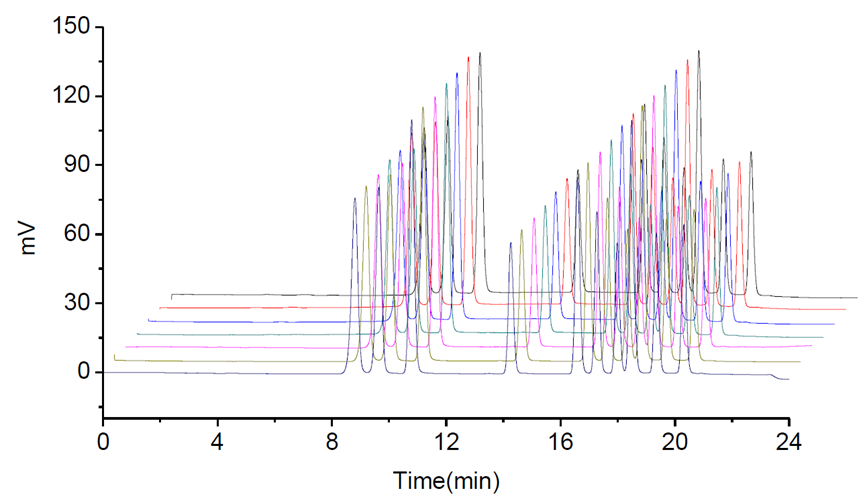 圖3 10種氨基甲酸酯連續(xù)進(jìn)樣疊加譜圖