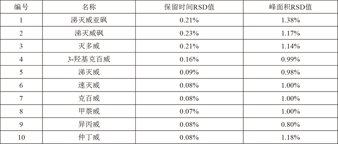 實(shí)際樣品(蘋(píng)果基質(zhì))中的10中氨基甲酸酯類(lèi)農(nóng)殘回收率均在84.15% ~ 100.37%之間,RSD值均小于4.35%,充分說(shuō)明該方法結(jié)果準(zhǔn)確,穩(wěn)定可靠。