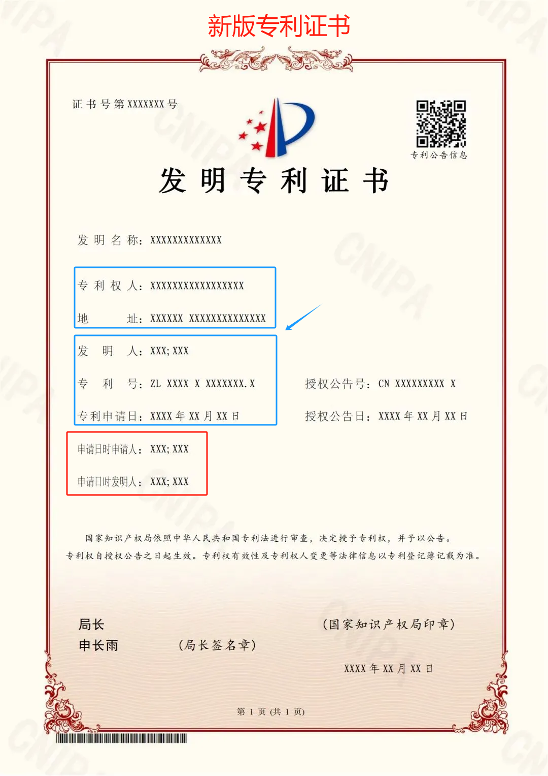 對于授權公告日在202461日之后(含當日)的專利,國家知識產權局頒發新版專利證書。新版專利證書沿用A4規格豎排版式,優化調整著錄事項布局。