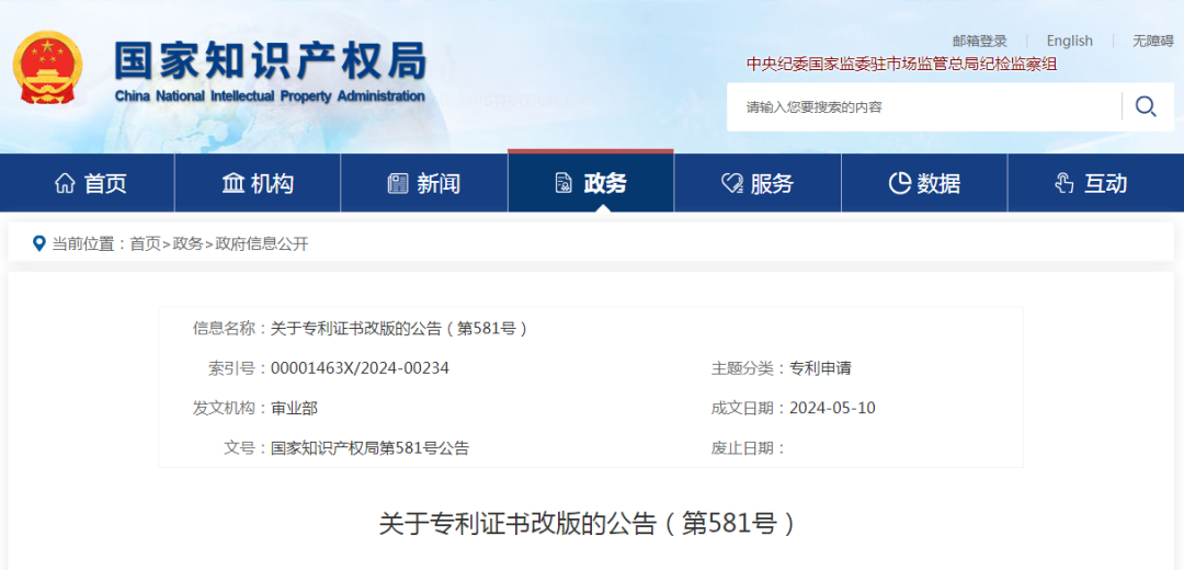 關于專利證書改版的公告(第581號)