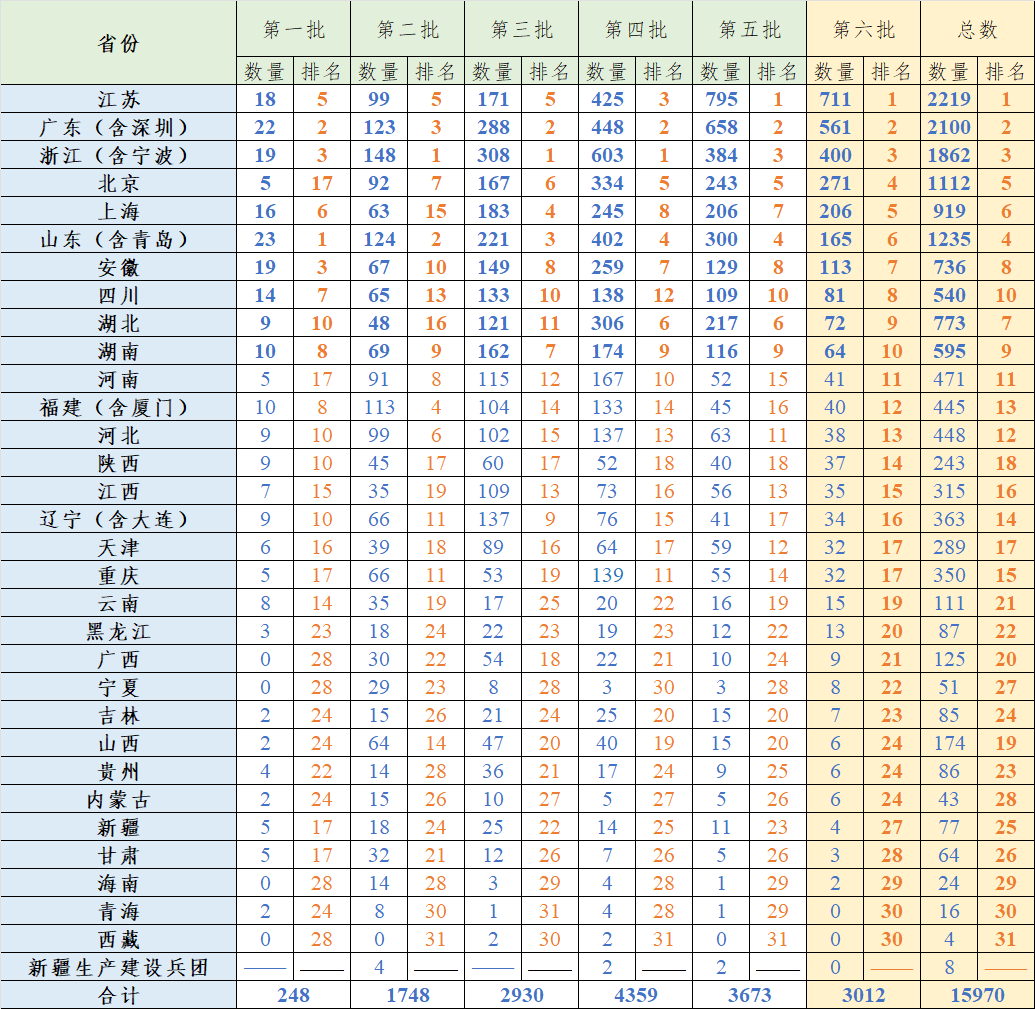 ➤(二)各省市第六批公示數(shù)量較前批次整體下降
