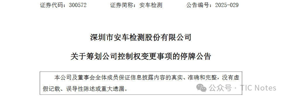 2025年7月29日,深圳市安車檢測股份有限公司發(fā)布《關(guān)于籌劃公司控制權(quán)變更事項(xiàng)的停牌公告》,公告顯示,公司于今日收到控股股東及實(shí)際控制人賀憲寧的通知,其正在籌劃股權(quán)轉(zhuǎn)讓及控制權(quán)變更相關(guān)事宜,該事項(xiàng)可能導(dǎo)致公司控股股東和實(shí)際控制人發(fā)生變更。目前各方尚未簽署相關(guān)正式交易協(xié)議,擬就具體交易方案、協(xié)議等相關(guān)事項(xiàng)進(jìn)行論證和磋商,具體情況以各方簽訂的相關(guān)正式交易協(xié)議為準(zhǔn)。