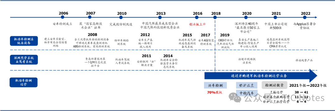據(jù)悉,安車檢測成立于2006年,2010年完成股份制改造,2016年于創(chuàng)業(yè)板上市。公司為機(jī)動車檢測綜合服務(wù)商,業(yè)務(wù)覆蓋全國31個省市,初期主業(yè)圍繞機(jī)動車檢測系統(tǒng)及檢測行業(yè)聯(lián)網(wǎng)監(jiān)管系統(tǒng),為業(yè)內(nèi)少數(shù)可提供系統(tǒng)方案設(shè)計(jì)、安裝集成、運(yùn)營維護(hù)及行業(yè)監(jiān)管等全鏈條服務(wù)的檢測設(shè)備供應(yīng)商之一,下游客戶主要包括全國各地的機(jī)動車檢驗(yàn)機(jī)構(gòu)、汽車制造廠、科研機(jī)構(gòu)等。2018年公司通過收購興車檢測70%股權(quán)切入機(jī)動車檢測站運(yùn)營,加速向下游產(chǎn)業(yè)鏈延伸,產(chǎn)業(yè)鏈布局持續(xù)完善。