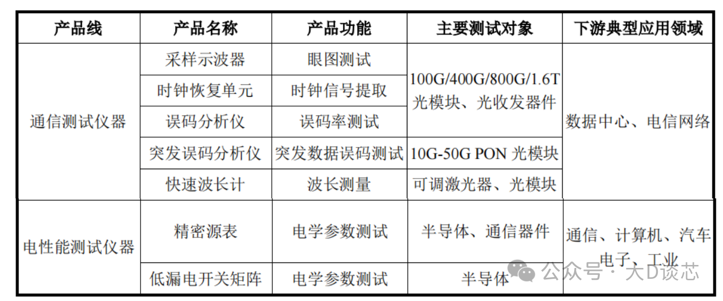 公司電子測(cè)量?jī)x器包括通信測(cè)試儀器和電性能測(cè)試儀器,通信測(cè)試儀器主要面向光通信測(cè)試,包括采樣示波器、時(shí)鐘恢復(fù)單元、誤碼分析儀等核心測(cè)試儀器;電性能測(cè)試儀器主要包括精密源表和低漏電開(kāi)關(guān)矩陣,廣泛應(yīng)用于通信和半導(dǎo)體等領(lǐng)域的高精度電學(xué)測(cè)試。