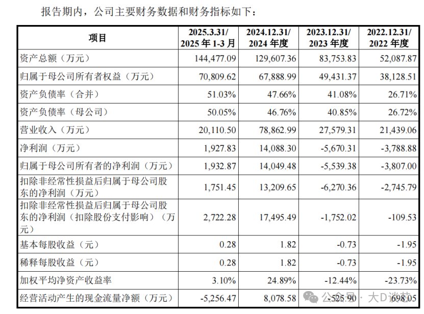 2022年至2025年3月,公司營(yíng)業(yè)收入分別為2.144億元、2.758億元、7.886億元和2.011億元,歸屬于母公司股東的凈利潤(rùn)分別為-3807.00萬(wàn)元、-5539.38萬(wàn)元、14,049.48萬(wàn)元和1,932.87萬(wàn)元。綜合毛利率分別為43.61%、60.50%、63.63%和65.33%。