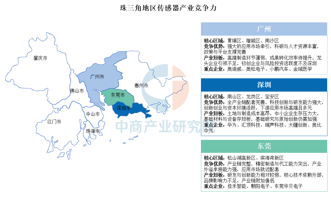 珠三角傳感器產業已形成廣深莞三地協同發展的格局:廣州憑借強大的應用市場、科研資源與政策支持見長,但高端制造與龍頭引領能力不足;深圳以完善的產業鏈、強大的研發創新和活躍的資本環境占據高地,但面臨高成本與基礎研究短板;東莞則依托突出的精密制造與產業鏈配套能力發揮重要作用,但在研發創新和品牌附加值上仍有待提升。