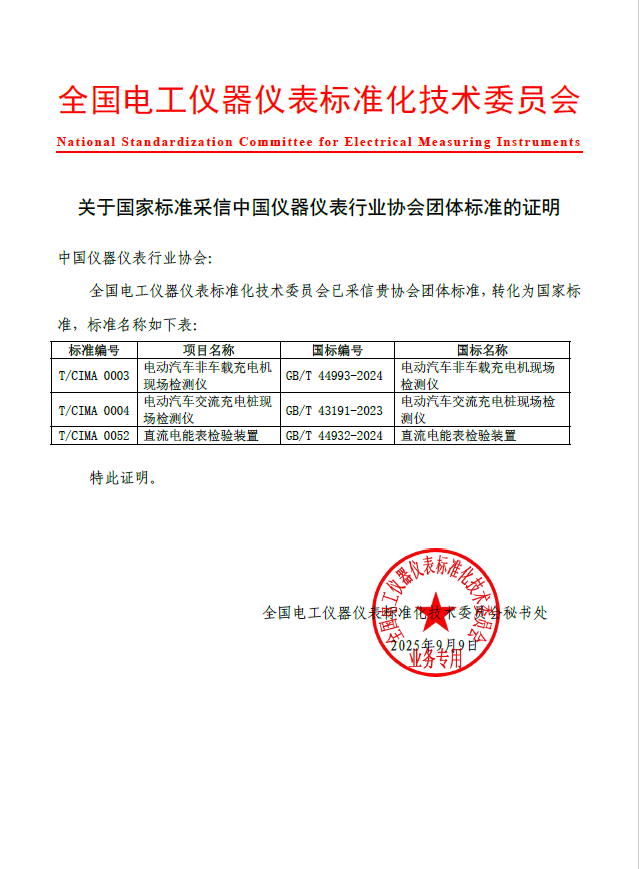 9月,全國電工儀器儀表標(biāo)準(zhǔn)化技術(shù)委員會給協(xié)會發(fā)來證明文件,協(xié)會的3項(xiàng)團(tuán)體標(biāo)準(zhǔn)已被國標(biāo)委采信,正式轉(zhuǎn)化為國家標(biāo)準(zhǔn)。