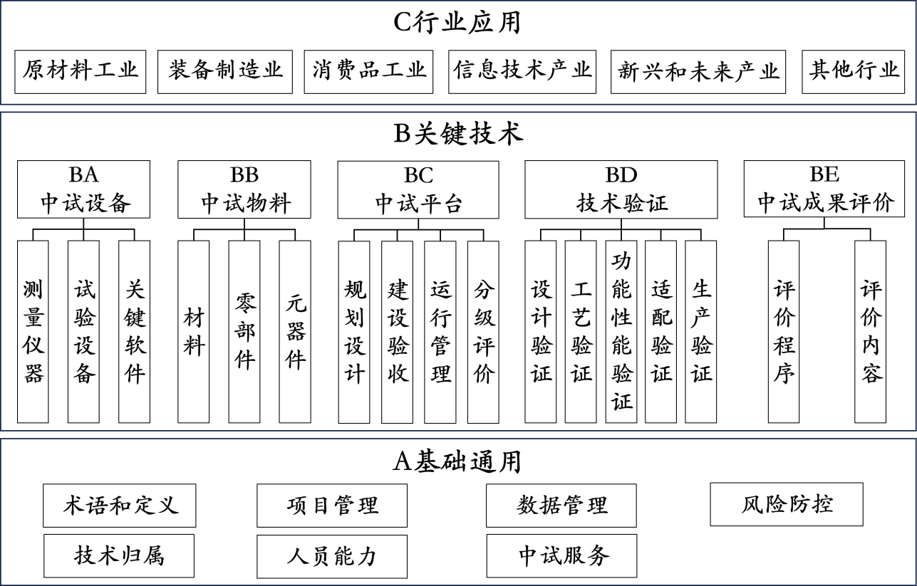 制造業(yè)中試標準體系結構包括基礎通用、關鍵技術、行業(yè)應用等3個部分,如圖1所示。其中,基礎通用標準規(guī)范制造業(yè)中試的通用性技術和要求,是制造業(yè)中試標準體系的底層支撐。關鍵技術標準規(guī)范制造業(yè)中試設備、物料、平臺、驗證、成果評價等要求,是制造業(yè)中試標準體系的核心內(nèi)容。行業(yè)應用標準規(guī)范各行業(yè)中試的應用要求,確保中試活動在具體行業(yè)規(guī)范科學開展,是制造業(yè)中試標準體系的應用拓展。