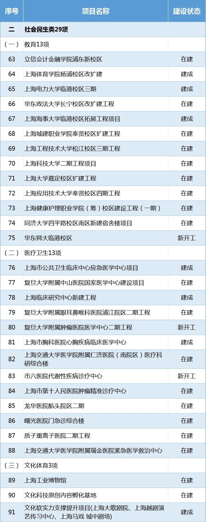 計(jì)劃建成7項(xiàng):上海體育學(xué)院楊浦校區(qū)改擴(kuò)建、上海電力大學(xué)臨港校區(qū)三期、上海海事大學(xué)臨港校區(qū)拓展工程項(xiàng)目、上海市公共衛(wèi)生臨床中心應(yīng)急醫(yī)學(xué)中心項(xiàng)目、上海臨床研究中心新建工程、上海市胸科醫(yī)院心胸疾病臨床醫(yī)學(xué)中心、文化軟實(shí)力支撐提升項(xiàng)目等。