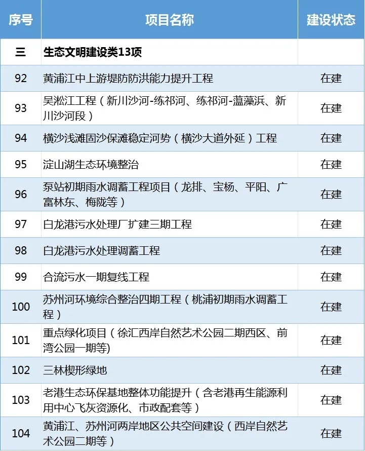 在建項(xiàng)目13項(xiàng):黃浦江中上游堤防防洪能力提升工程、吳淞江工程(新川沙河-練祁河、練祁河-蕰藻浜、新川沙河段)、淀山湖生態(tài)環(huán)境整治等。